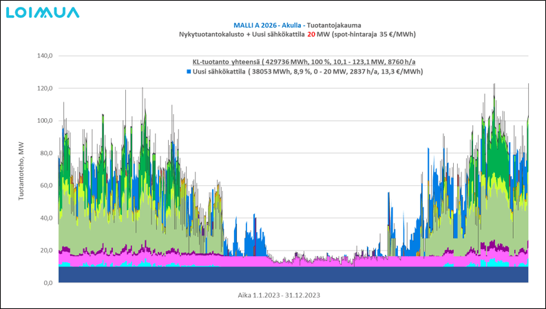 Esiselvityksessä tavoitteena oli mitoittaa ja optimoida kaukolämpöverkostoon liitettävä sähkökattila- ja lämpöakkuyksikkö. Lämmöntuotannon mittaustrendeihin ja sähkön spot-hintahistoriatietoihin perustuen määritettiin tuotantomäärät energian hintoineen tarkasteltaville sähkökattilatehoille, sekä muutokset olemassa olevien yksiköiden tuotantoihin.